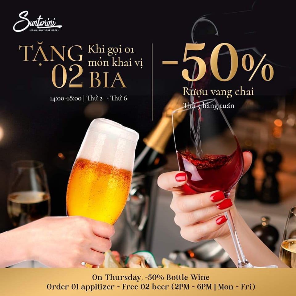 {"id":582348,"name":"HOT: 02 ƯU ĐÃI “CỰC PHẨM” CHIÊU ĐÃI QUÝ KHÁCH GHÉ THĂM NHÀ HÀNG HẢI SẢN SUNTORINI.","desc":"<p><img alt=\"????\" height=\"16\" referrerpolicy=\"origin-when-cross-origin\" src=\"https:\/\/static.xx.fbcdn.net\/images\/emoji.php\/v9\/teb\/1\/16\/1f377.png\" width=\"16\" \/><img alt=\"????\" height=\"16\" referrerpolicy=\"origin-when-cross-origin\" src=\"https:\/\/static.xx.fbcdn.net\/images\/emoji.php\/v9\/t96\/1\/16\/1f37b.png\" width=\"16\" \/><img alt=\"????\" height=\"16\" referrerpolicy=\"origin-when-cross-origin\" src=\"https:\/\/static.xx.fbcdn.net\/images\/emoji.php\/v9\/t68\/1\/16\/1f374.png\" width=\"16\" \/> GIẢM SỐC 50% GIÁ RƯỢU VANG CHAI vào thứ 5 hàng tuần.<\/p>\n\n<p><img alt=\"????\" height=\"16\" referrerpolicy=\"origin-when-cross-origin\" src=\"https:\/\/static.xx.fbcdn.net\/images\/emoji.php\/v9\/t15\/1\/16\/1f37a.png\" width=\"16\" \/><img alt=\"????\" height=\"16\" referrerpolicy=\"origin-when-cross-origin\" src=\"https:\/\/static.xx.fbcdn.net\/images\/emoji.php\/v9\/t68\/1\/16\/1f374.png\" width=\"16\" \/><img alt=\"????\" height=\"16\" referrerpolicy=\"origin-when-cross-origin\" src=\"https:\/\/static.xx.fbcdn.net\/images\/emoji.php\/v9\/t68\/1\/16\/1f374.png\" width=\"16\" \/> BIA UỐNG THẢ GA - KHÔNG LO VỀ GIÁ: TẶNG 02 BIA KHI GỌI 01 MÓN KHAI VỊ (không giới hạn số lượng bia tặng). Áp dụng từ 14:00 đến 18:00, Thứ 2 - Thứ 6.<\/p>\n","content":"<p>HOT: 02 ƯU ĐÃI “CỰC PHẨM” CHIÊU ĐÃI QUÝ KHÁCH GHÉ THĂM NHÀ HÀNG HẢI SẢN SUNTORINI.<\/p>\n\n<p><img alt=\"????\" height=\"16\" referrerpolicy=\"origin-when-cross-origin\" src=\"https:\/\/static.xx.fbcdn.net\/images\/emoji.php\/v9\/teb\/1\/16\/1f377.png\" width=\"16\" \/><img alt=\"????\" height=\"16\" referrerpolicy=\"origin-when-cross-origin\" src=\"https:\/\/static.xx.fbcdn.net\/images\/emoji.php\/v9\/t96\/1\/16\/1f37b.png\" width=\"16\" \/><img alt=\"????\" height=\"16\" referrerpolicy=\"origin-when-cross-origin\" src=\"https:\/\/static.xx.fbcdn.net\/images\/emoji.php\/v9\/t68\/1\/16\/1f374.png\" width=\"16\" \/> GIẢM SỐC 50% GIÁ RƯỢU VANG CHAI vào thứ 5 hàng tuần.<\/p>\n\n<p><img alt=\"????\" height=\"16\" referrerpolicy=\"origin-when-cross-origin\" src=\"https:\/\/static.xx.fbcdn.net\/images\/emoji.php\/v9\/t15\/1\/16\/1f37a.png\" width=\"16\" \/><img alt=\"????\" height=\"16\" referrerpolicy=\"origin-when-cross-origin\" src=\"https:\/\/static.xx.fbcdn.net\/images\/emoji.php\/v9\/t68\/1\/16\/1f374.png\" width=\"16\" \/><img alt=\"????\" height=\"16\" referrerpolicy=\"origin-when-cross-origin\" src=\"https:\/\/static.xx.fbcdn.net\/images\/emoji.php\/v9\/t68\/1\/16\/1f374.png\" width=\"16\" \/> BIA UỐNG THẢ GA - KHÔNG LO VỀ GIÁ: TẶNG 02 BIA KHI GỌI 01 MÓN KHAI VỊ (không giới hạn số lượng bia tặng). Áp dụng từ 14:00 đến 18:00, Thứ 2 - Thứ 6.<\/p>\n\n<p>CAM KẾT:<\/p>\n\n<p><img alt=\"????\" height=\"16\" referrerpolicy=\"origin-when-cross-origin\" src=\"https:\/\/static.xx.fbcdn.net\/images\/emoji.php\/v9\/t51\/1\/16\/1f449.png\" width=\"16\" \/> Suntorini Boutique Hotel tự hào đem đến cho bạn những trải nghiệm tuyệt vời trong không gian sang trọng, phong cách phục vụ chuyên nghiệp với những món ăn tươi ngon được chế biến bởi Bếp trưởng địa phương nhiều năm kinh nghiệm.<\/p>\n\n<p><img alt=\"????\" height=\"16\" referrerpolicy=\"origin-when-cross-origin\" src=\"https:\/\/static.xx.fbcdn.net\/images\/emoji.php\/v9\/tc8\/1\/16\/1f440.png\" width=\"16\" \/> Đừng bỏ lỡ, NHẮN TIN ĐẶT BÀN NGAY!<\/p>\n\n<p>*Lời nhắn: Chương trình không áp dụng đồng thời cùng các ưu đãi khác<\/p>\n\n<p>—---------------------------------<\/p>\n\n<p>02 INTERESTING OFFERS TO INDULGE OUR PRIDE AND PRECIOUS GUESTS WHO VISIT SUNTORINI SEAFOOD RESTAURANT.<\/p>\n\n<p>With our exclusive deals, delightful beach feasts will be even more enjoyable and affordable:<\/p>\n\n<p><img alt=\"????\" height=\"16\" referrerpolicy=\"origin-when-cross-origin\" src=\"https:\/\/static.xx.fbcdn.net\/images\/emoji.php\/v9\/teb\/1\/16\/1f377.png\" width=\"16\" \/><img alt=\"????\" height=\"16\" referrerpolicy=\"origin-when-cross-origin\" src=\"https:\/\/static.xx.fbcdn.net\/images\/emoji.php\/v9\/t96\/1\/16\/1f37b.png\" width=\"16\" \/><img alt=\"????\" height=\"16\" referrerpolicy=\"origin-when-cross-origin\" src=\"https:\/\/static.xx.fbcdn.net\/images\/emoji.php\/v9\/t68\/1\/16\/1f374.png\" width=\"16\" \/>Every Thursday, a startling 50% discount is offered on bottles of wine.<\/p>\n\n<p><img alt=\"????\" height=\"16\" referrerpolicy=\"origin-when-cross-origin\" src=\"https:\/\/static.xx.fbcdn.net\/images\/emoji.php\/v9\/t15\/1\/16\/1f37a.png\" width=\"16\" \/><img alt=\"????\" height=\"16\" referrerpolicy=\"origin-when-cross-origin\" src=\"https:\/\/static.xx.fbcdn.net\/images\/emoji.php\/v9\/t68\/1\/16\/1f374.png\" width=\"16\" \/><img alt=\"????\" height=\"16\" referrerpolicy=\"origin-when-cross-origin\" src=\"https:\/\/static.xx.fbcdn.net\/images\/emoji.php\/v9\/t68\/1\/16\/1f374.png\" width=\"16\" \/> Receive two free beers when you order one appetizer. This offer is valid from 2 pm to 6 pm, Monday through Friday.<\/p>\n\n<p><img alt=\"????\" height=\"16\" referrerpolicy=\"origin-when-cross-origin\" src=\"https:\/\/static.xx.fbcdn.net\/images\/emoji.php\/v9\/t51\/1\/16\/1f449.png\" width=\"16\" \/>Suntorini Boutique Hotel is dedicated to providing you with an extraordinary experience in an opulent setting, with professional and refined service and delectably fresh cuisine, created by our in-house chef with years of experience.<\/p>\n\n<p><img alt=\"????\" height=\"16\" referrerpolicy=\"origin-when-cross-origin\" src=\"https:\/\/static.xx.fbcdn.net\/images\/emoji.php\/v9\/tc8\/1\/16\/1f440.png\" width=\"16\" \/> SEND US A MESSAGE TO BOOK YOUR TABLE NOW SO YOU DON'T MISS OUT!<\/p>\n\n<p>*Note: This deal